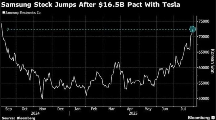 (Bloomberg) — Samsung Electronics Co.’s surprise $16.5 billion chipmaking deal with Tesla Inc. has breathed new life into a foundry business all but written off by many investors.