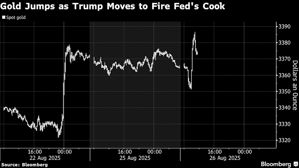 Gold rose after US President Donald Trump moved to oust Federal Reserve Governor Lisa Cook with immediate effect, raising concerns about central bank independence and the prospect of strengthening haven demand.