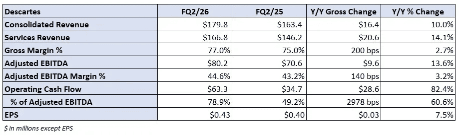 Descartes reported adjusted earnings before interest, taxes, depreciation and amortization of $80 million, which was 14% higher y/y. The company recorded an adjusted EBITDA margin of 44.6%, 140 basis points higher y/y.