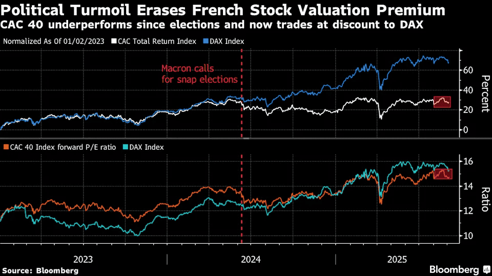 Since Macron shocked France by calling a snap election in June 2024, creating the current stalemate, the CAC 40 has fallen 4.1%, compared with a 4.9% gain for the Stoxx Europe 600 Index and a 24% rise in Germany’s DAX Index excluding dividends.