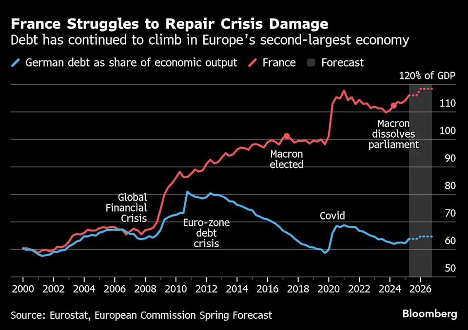 France’s fiscal deficit is now the widest in the euro area. Debt is rising by €5,000 ($5,840) a second, and the cost of servicing it is set to hit €75 billion next year, according to the government.