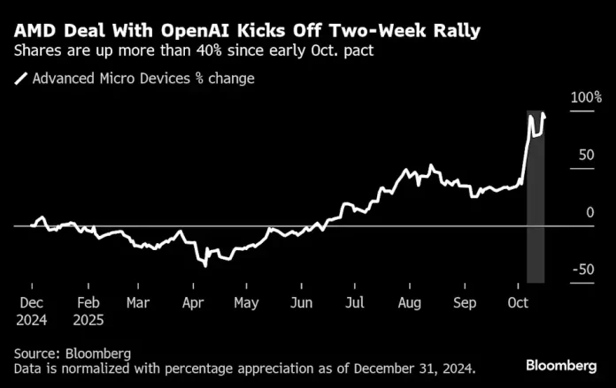 In the two weeks since AMD and OpenAI announced their blockbuster deal, the chipmaker’s stock has soared more than 40%. AMD also landed a major order from Oracle Corp. this week, further juicing its shares. Meanwhile, Broadcom unveiled its own agreement with OpenAI on Monday, sending its shares up 10% in a single session, their best performance since April.