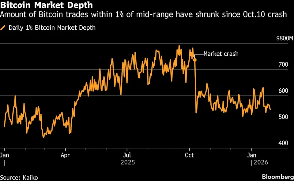 Bitcoin’s market depth, a measure of capital available to absorb large trades, remains more than 30% below its October peak, according to Kaiko data. The last time liquidity fell this far was after the FTX collapse in 2022.
