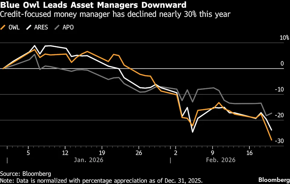 Investors reacted fast. Shares of Blue Owl tumbled as much as 10% on Thursday and triggered a broad decline in the stocks of money managers with fingers in the private credit pie. Ares Management Corp., Blackstone Inc. and Apollo Global Management Inc. were among those dragged down. Blue Owl’s shares have now plunged almost 60% in the past 13 months, even as the firm’s revenue continued to climb in that period.