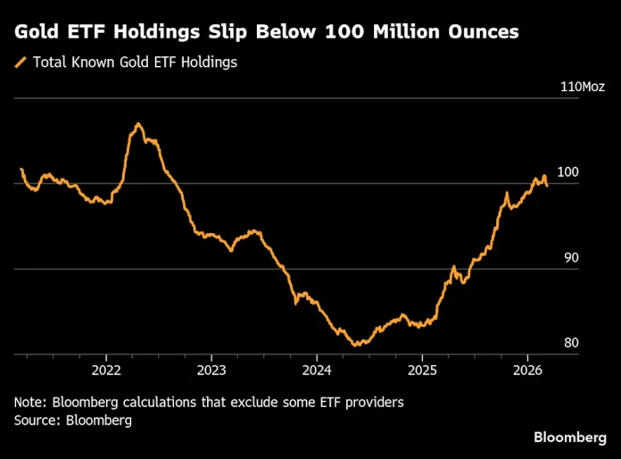 Since war broke out, the volume of gold held by exchange-traded funds has declined. Total holdings fell by nearly 30 tons last week, marking the biggest weekly selloff in more than two years, according to data compiled by Bloomberg.