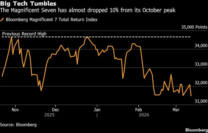 A swoon in US stocks has left technology giants on the brink of a correction as the war in Iran drives up oil prices and sparked inflation worries.